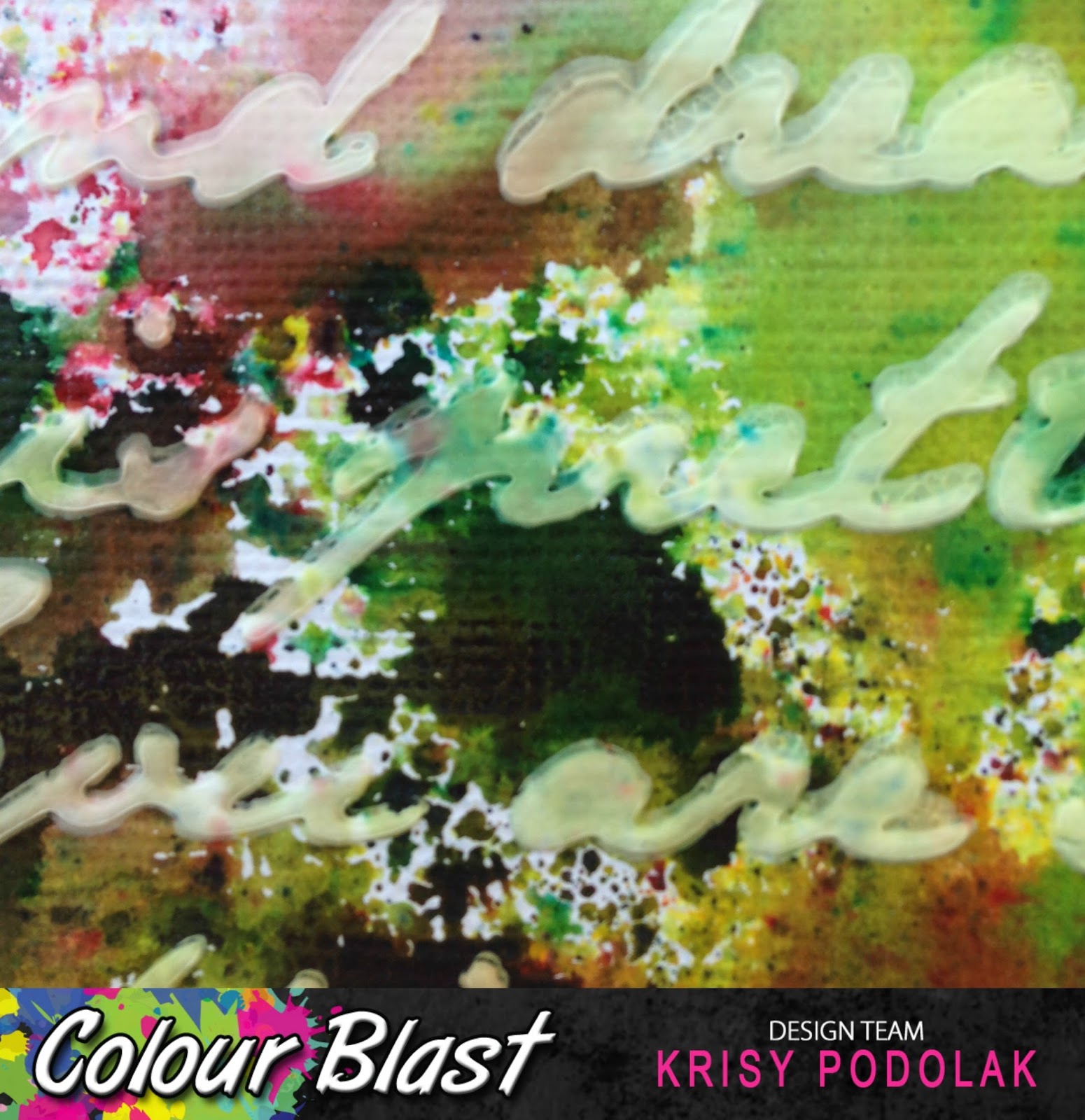 For this one I watched heaps of You Tube videos on how to use the brush and ultimately you splatter liquid. So I made up a fair bit of liquid colour as per the first technique and then splattered it onto the paper. I started from one corner and splattered in one direction as I had a final idea in mind on what I wanted to do with this layout. To splatter with this brush you hold it in one hand and then with the other you flick the bristles. They are really quite stiff and create a nice even splatter. Once you splatter one colour you must make sure you dry it thoroughly between colours to avoid them mixing too much and making a big mess. I just repeated the process until I was happy with the result.