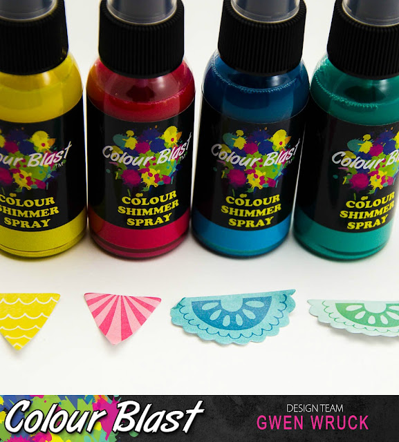 I didn't end up using the banners on the final page, but they definitely helped with narrowing down my colour choice. (Seems I have too many pretty Colour Blast colours to choose from!) Now that colours were locked in, I went about spraying sections of some white cardstock paper scraps. I didn't bother adding Gesso as I knew it would just be a fine mist I would be applying. I tried to make the sprays uneven for interest. I also add a few splatters using the nozzle of the sprayer while the colour was still wet. Doing it this way softens the splatters are they tend to blend into the background rather than sitting on top like they do when applied over dry spray.