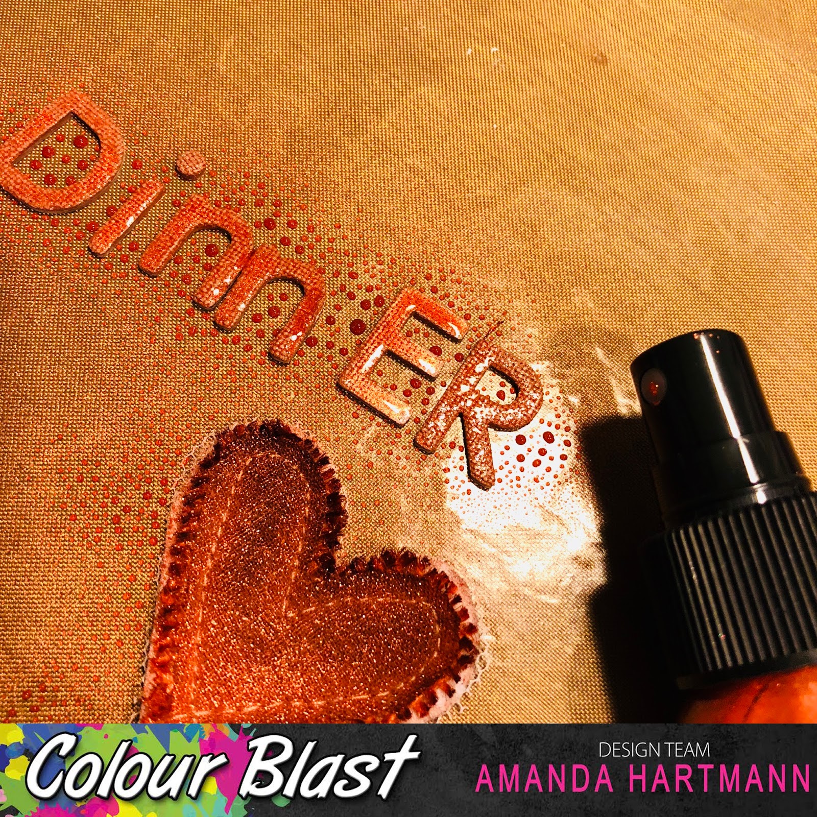 Firstly, I coloured a Charms Creations DIY heart. These hearts are white and canvas and are perfect for colouring with Colour Blast. After spraying with some water, I painted the heart with Colour Artist Inks in Rust.