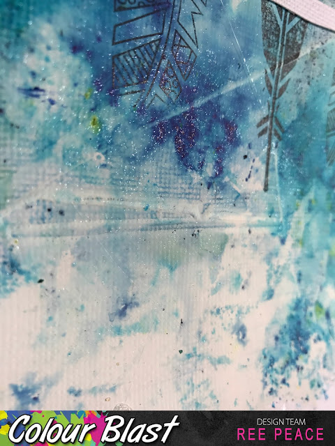 Then I got to do the 'dusting' using three green and blue tones of Colour Shimmer Dust, Duke, Peacock and Navy. I used a dry paintbrush that I dipped into the pot, tapped of the excess and then tapped across my DRY gesso'd page. I did this with all three colours, randomly.