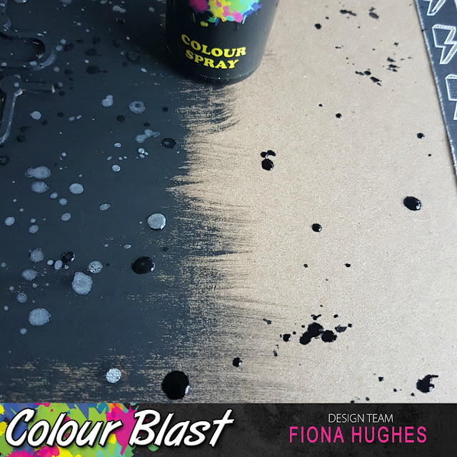 Then, I chose my 3 favourite colours within the range of sprays,- Colour Spray in- Roadbase & Colour Shimmer Spray in- Steel & Stormy Weather. I used these lil gems, to make splatters over the entire page, (as is one of my "things").